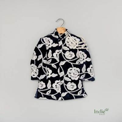 Navy Blue Kurta With White Floral Embroidery And Pearl Accents Paired With White Pant