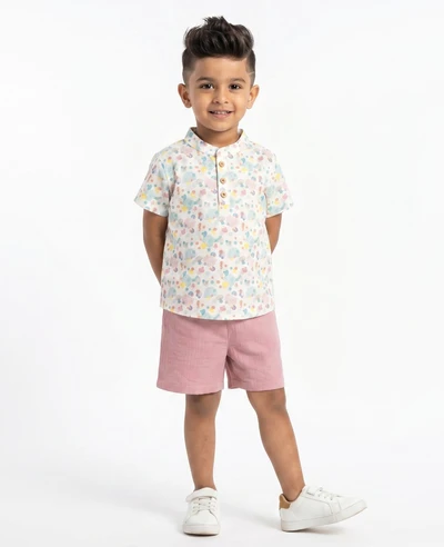 Top and bottom set is the perfect blend of style and comfort. Featuring a mandarin collar, half sleeves, and vibrant ethnic print, the shirt is made with soft and breathable Cotton fabric. The matching solid cotton shorts complete the look with a concealed elasticated waistband for a comfortable fit, creating an effortless outfit that's perfect for any occasion.