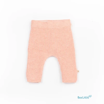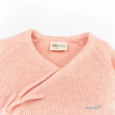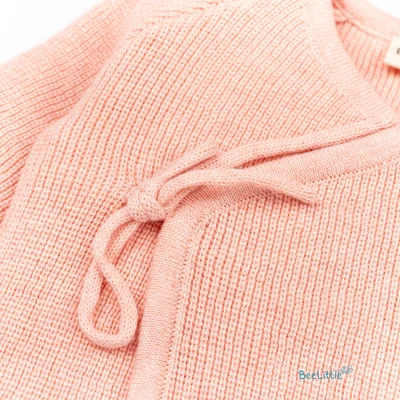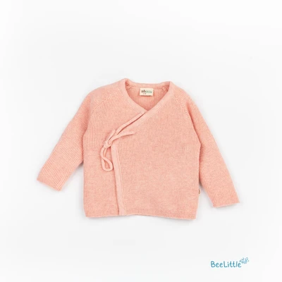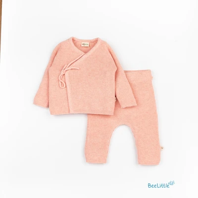 Organic warmer set consists of a sweater and pants. Knitted sweater in ribbed waist hem, round rib crew neck and long sleeves with cuffed trim. The kimono styled vest is secured with a tiny tie-up. Set up with knitted jogger style pants with waist elastication that can be slipped on.