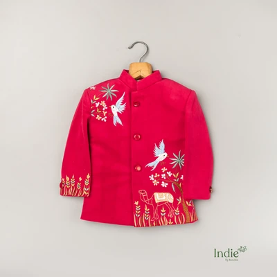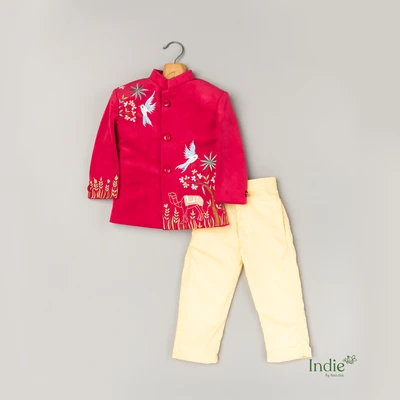 Golden Bird Embroidered Red Velvet Kurta With Beige Pant