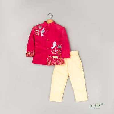 Rani Pink Kurta With Bird Embroidery Paired With Beige Pant