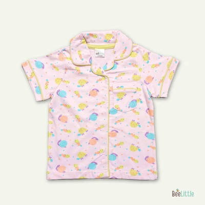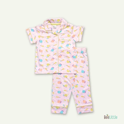 Pyjama set with a shirt and bottom in silky soft cotton material with contrast color piping. Quirky printed shirt is patterned with notched lapel collar, straight button placket at the front, one patch pocket at the left chest and short sleeveless. Suited up with parallel trousers has concealed elasticated waistband and slip on closure.