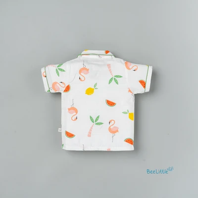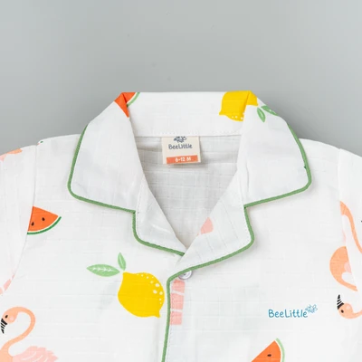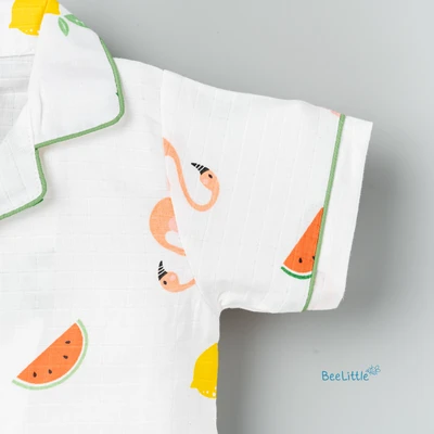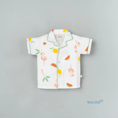 Our Pyjama sets offer comfort and style for your little one's restful night's sleep. Each set includes a short-sleeve button-up top with a classic collar and chest pocket, finished with contrasting piping. The matching pants feature an elastic waistband and piped cuffs. Made from soft, breathable fabric, they are gentle on baby's skin and are perfect for year-round wear.