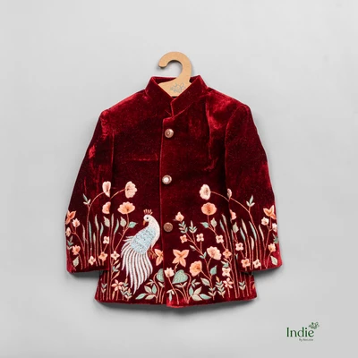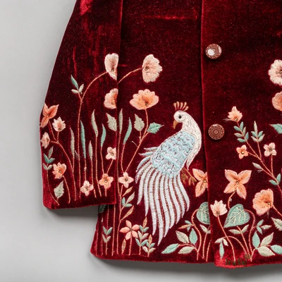 White Peacock Embroidered Red Velvet Kurta With Beige Pant